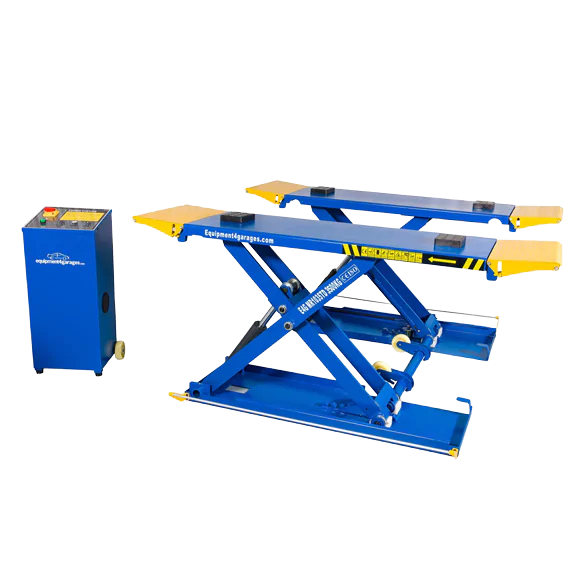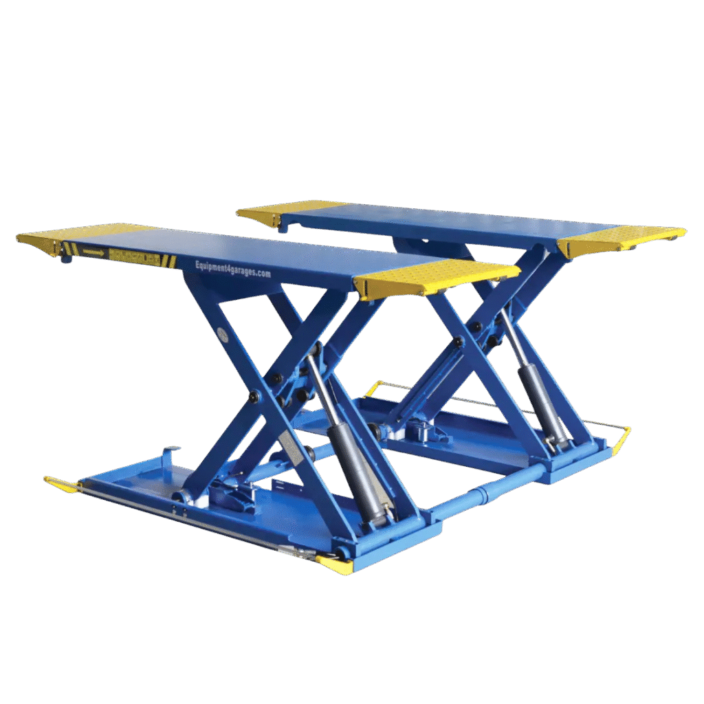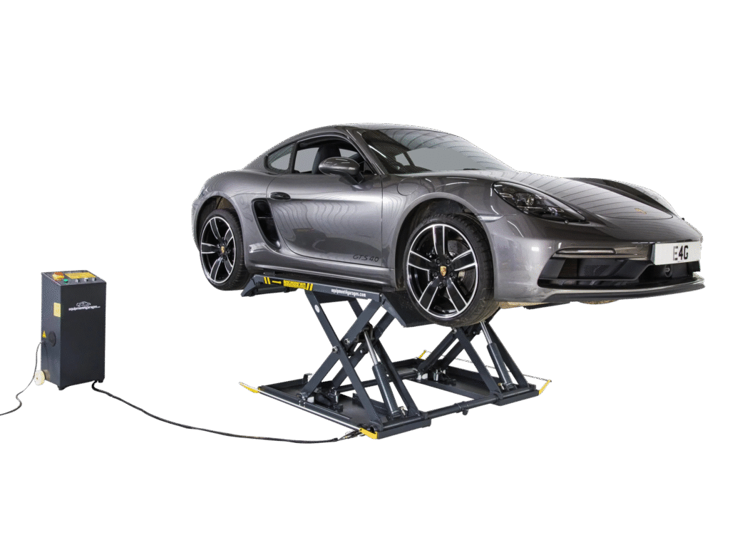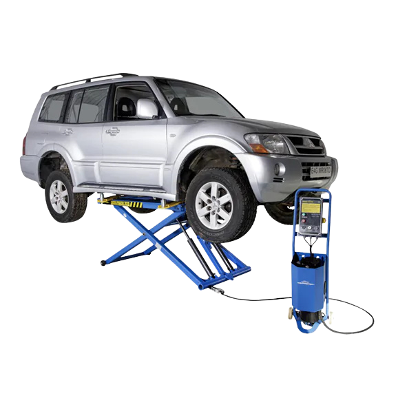 Choose your ramps from five colours: Royal Blue, Red, Yellow, Racing Green or Dark Grey. Mid-rise portable scissor lift designed for Tyre Bays, Bodyshops, Workshops, and Detailing Shops. Now available in sleek Dark Grey, it features electric/hydraulic power, a 24V control system, and variable locking positions. Includes moving kit and rubber blocks.